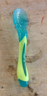 This is a plastic spoon we bought from the "Casa". It's plastic and therefore it shouldn't have an extra coating layer, because her teeth can't be damaged. If this spoon is okay, we need some kind of clicking system, so this type of spoon can be clicked into the right handle.